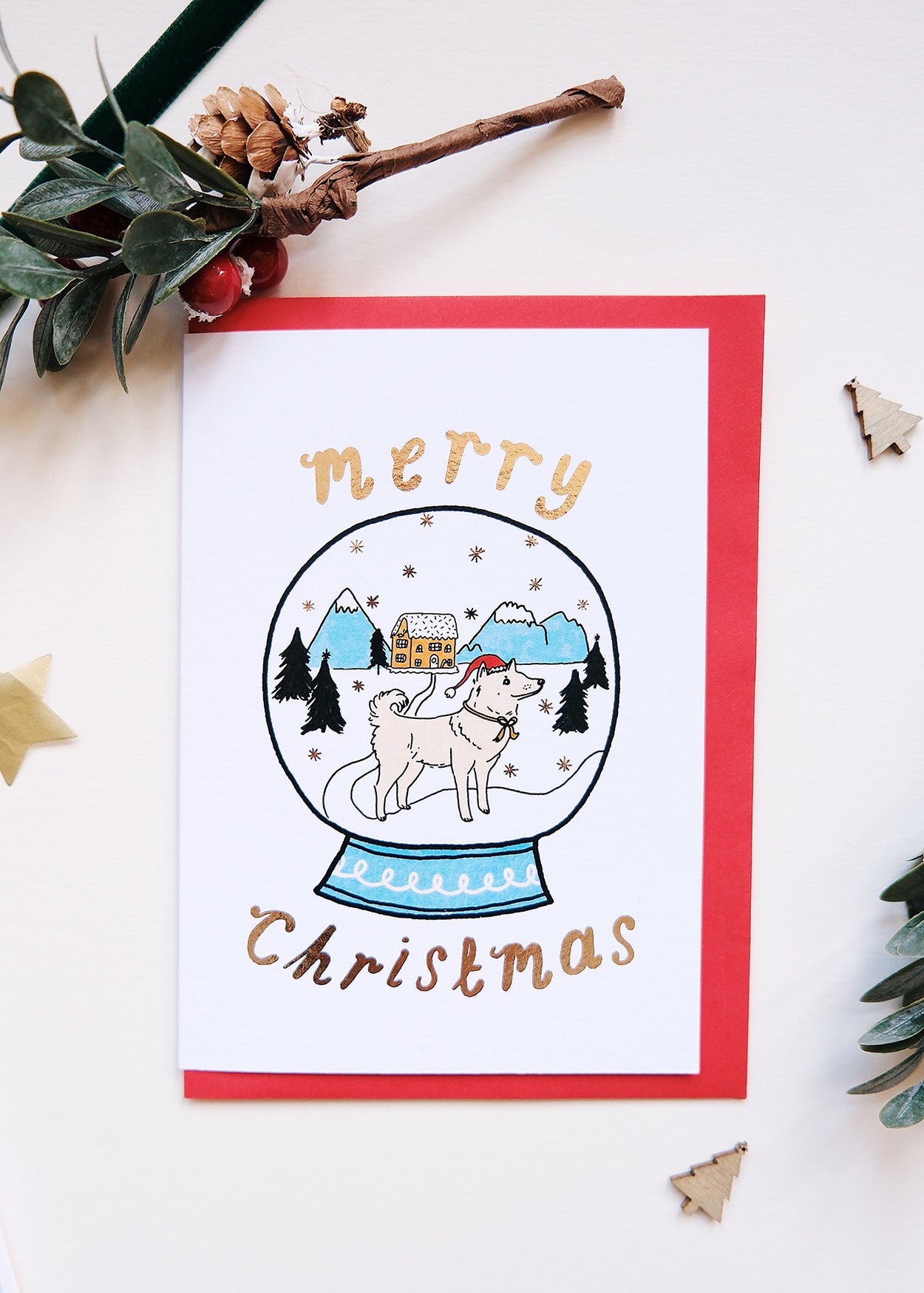 Merry Christmas sweet snow-globe doggy. Gold foiled Christmas card. Blank inside for your own message. Featuring a cute festive Shiba Inu.